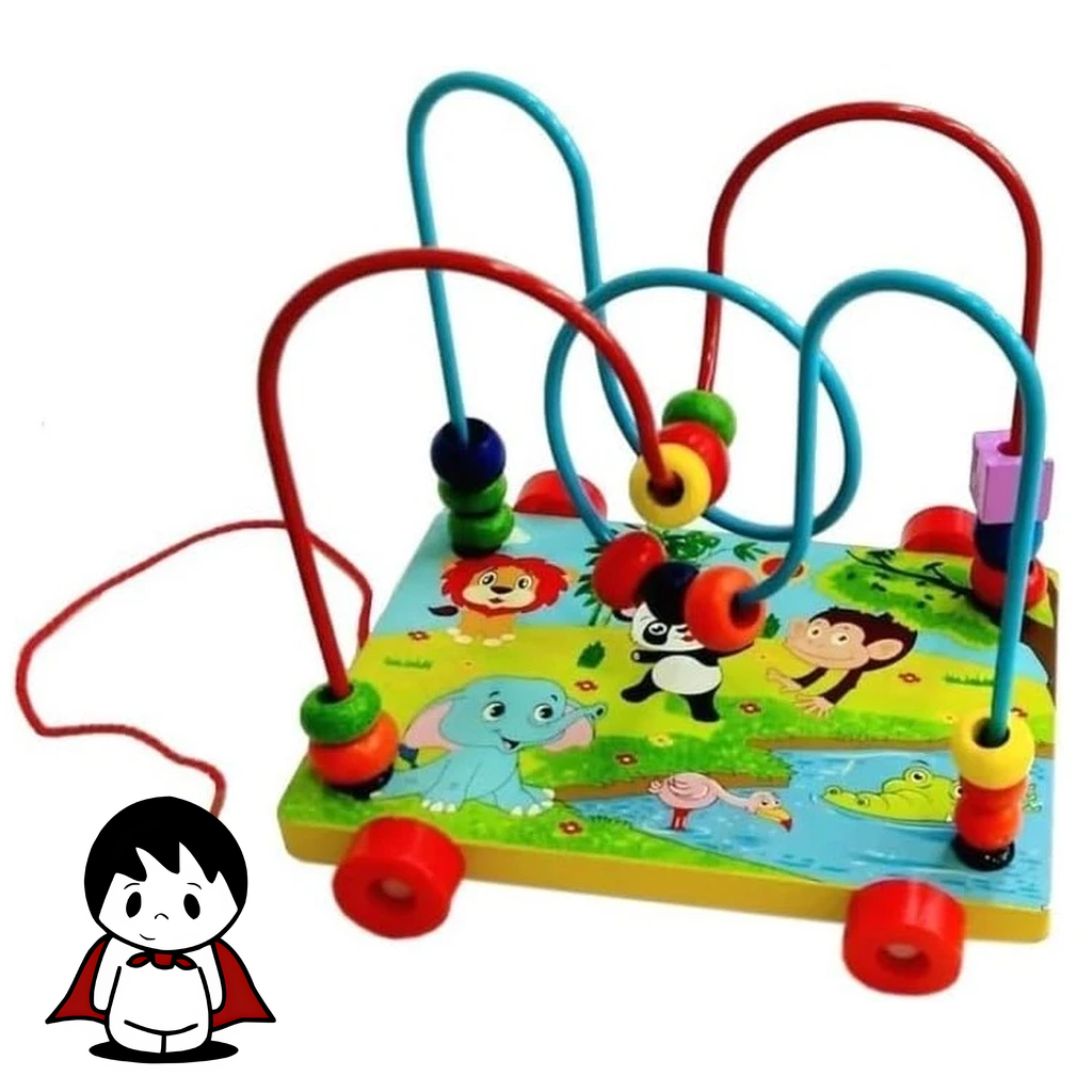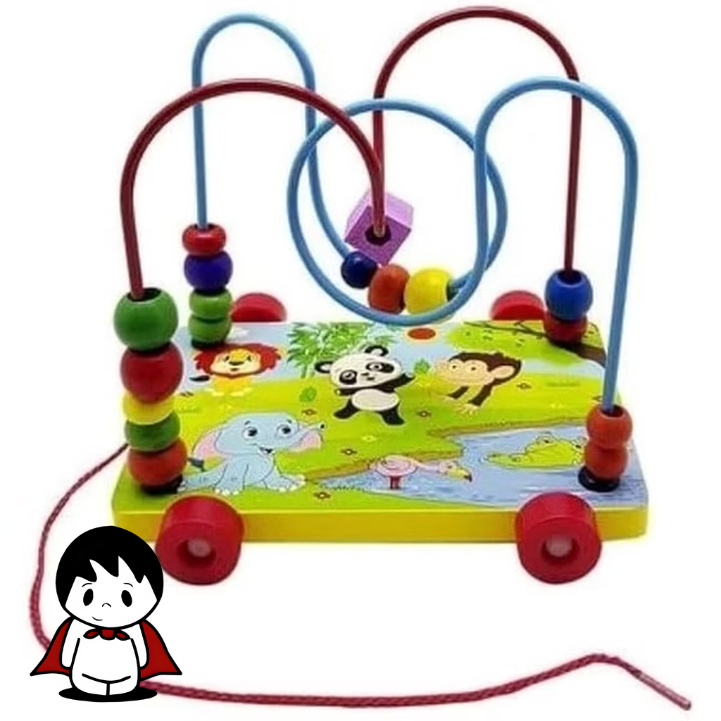 - محتویات بسته: شامل یک عدد پایه چوبی چرخدار با طرح حیوانات (مانند حیوانات جنگل یا موجودات اقیانوس)، میلههای فلزی پرپیچوخم و مهرههای چوبی رنگارنگ به همراه یک نخ برای کشیدن اسباببازی.