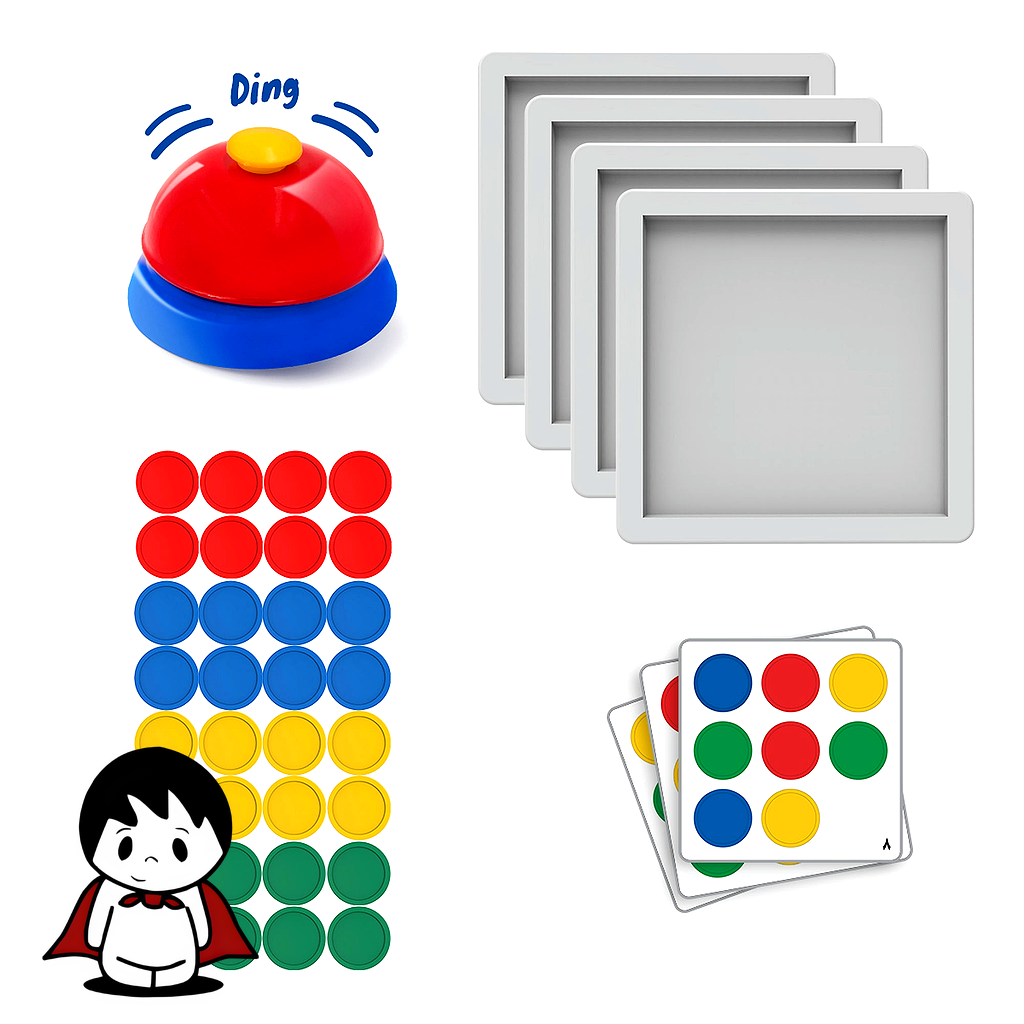 - محتویات جعبه: ۱۶ عدد مهره رنگی، ۲ عدد صفحه بازی، ۱ عدد زنگ فلزی، ۲۰ عدد کارت الگو و دفترچه راهنما