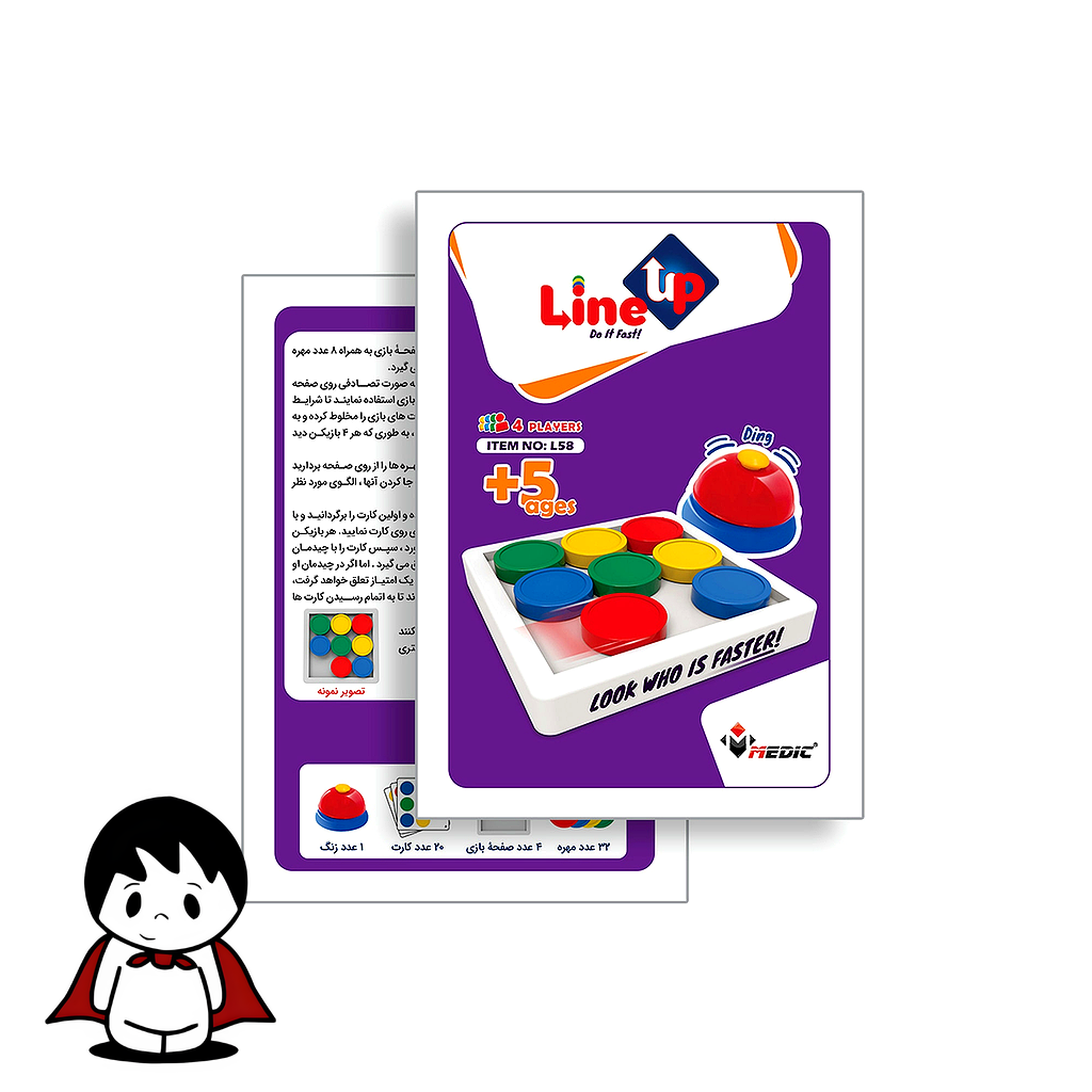 بازی فکری “لاین آپ” یک رقابت نفسگیر و پرهیجان برای محک زدن هوش، سرعت و دقت شماست. این بازی که برای گروههای تا ۴ نفر طراحی شده، یک سرگرمی فوقالعاده برای دورهمیهای خانوادگی و دوستانه است. در هر دور از بازی، یک کارت الگو رو میشود و بازیکنان باید با سرعتی باورنکردنی، مهرههای رنگی خود را دقیقاً مطابق با الگوی روی کارت در صفحه بازی خود بچینند. اولین کسی که موفق به تکمیل الگو شود و زنگ وسط را به صدا درآورد، برنده آن دور خواهد بود. این بازی ترکیبی بینظیر از استراتژی لحظهای و واکنش سریع است.