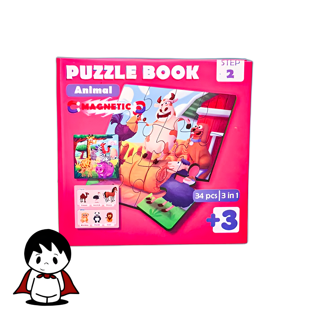 - محتویات بسته: شامل ۱ دفترچه تاشو با صفحه مغناطیسی و ۳۴ قطعه پازل آهنربایی با طرح حیوانات.