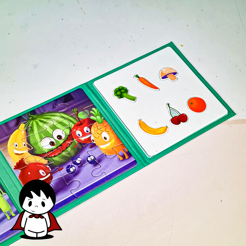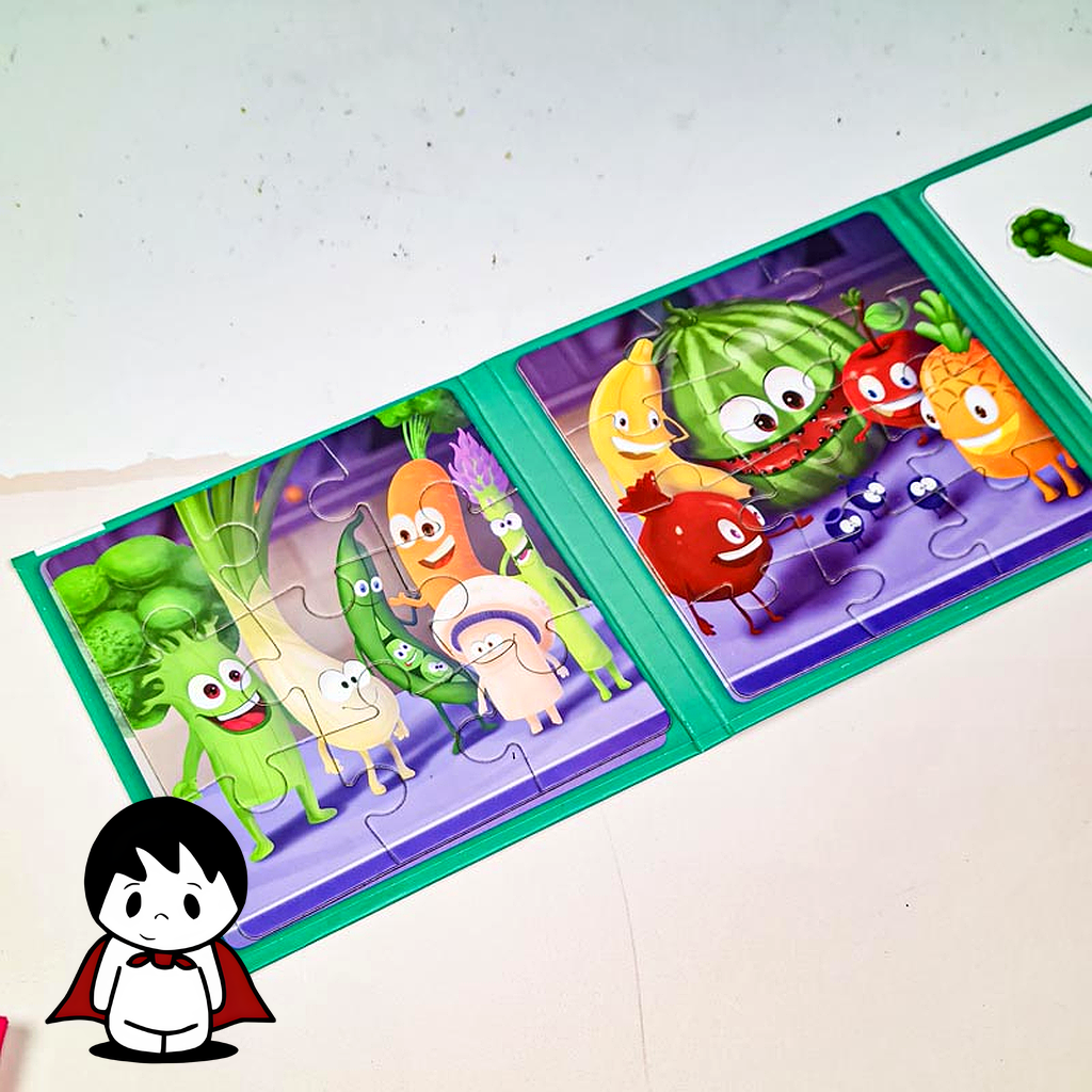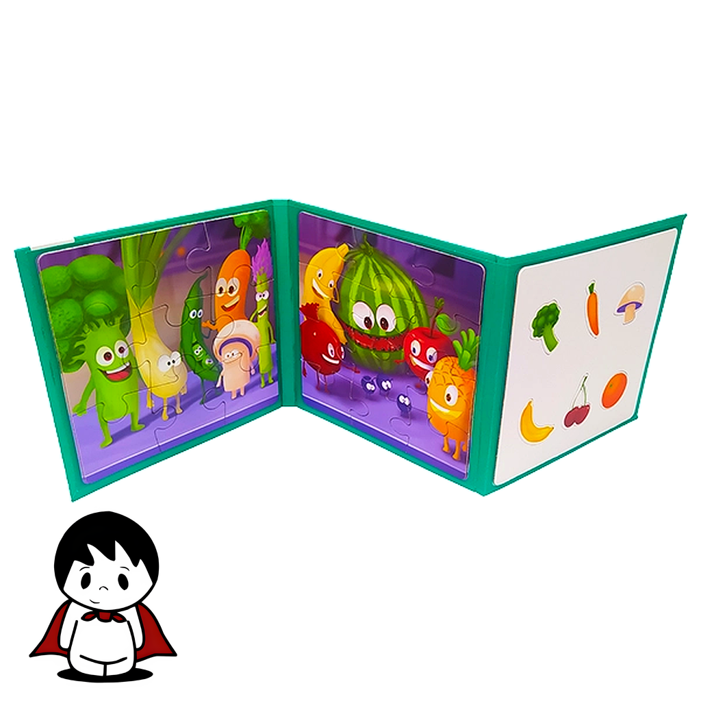 - محتویات غنی: بسته شامل ۱ دفترچه تاشو با صفحه مغناطیسی و ۲۷ قطعه پازل آهنربایی با طرحهای متنوع سبزیجات است.