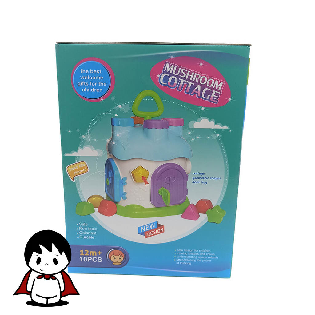 - محتویات بسته: این مجموعه شامل ۱ عدد کلبه پلاستیکی قارچی شکل با حفرههای هندسی، ۱۰ عدد بلوک رنگی در اشکال هندسی متنوع، و ۱ عدد کلید پلاستیکی برای باز کردن درب کلبه است.